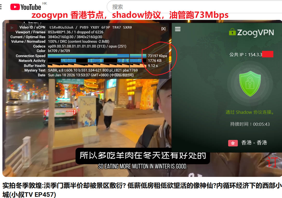 1月18日下午,电信宽带WiFi,分别测试了香港1、韩国首尔1、日本东京1三个节点,连接协议都是默认的shadow协议,使用speedtest测试速度分别为:78Mbps、79Mbps、81Mbps ;测试youtube油管速度分别为73Mbps、40Mbps、66Mbps,三个节点表现非常优秀,尤其是香港和日本东京节点!如下图所示