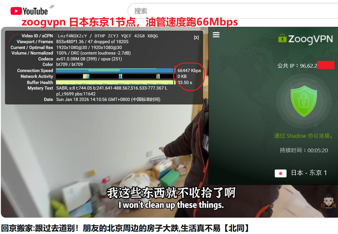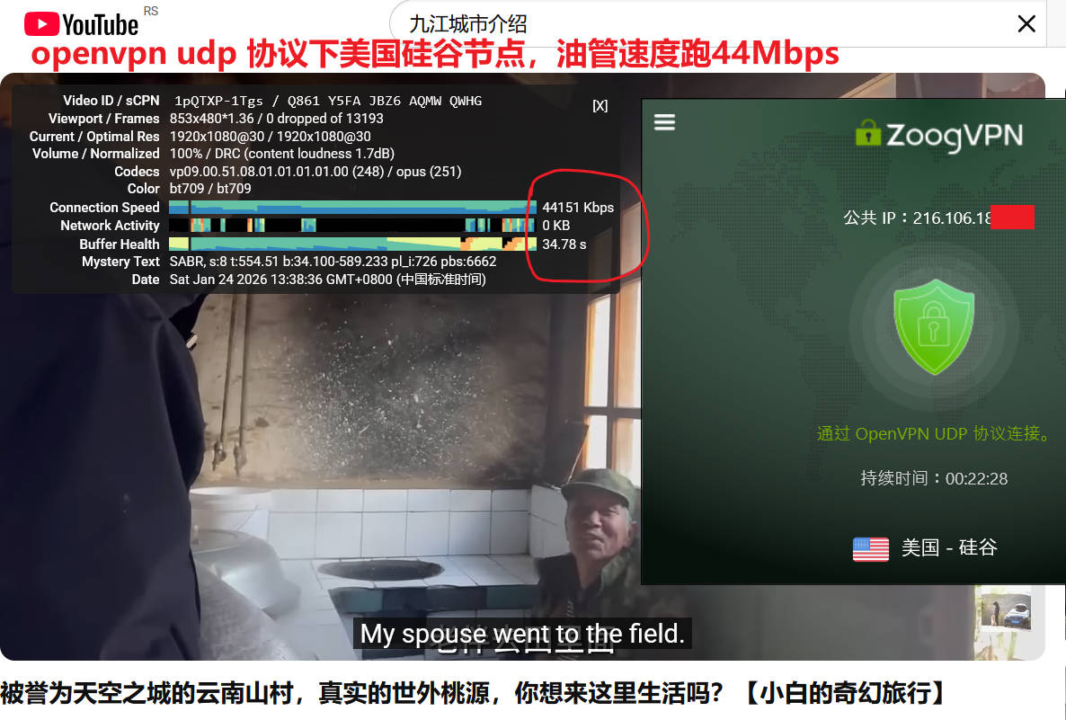 2026年zoogvpn 实测来袭,1月2日晚高峰期,联通宽带WiFi(联通无线路由器隔一个房间,笔记本连接wifi下实测带宽就跑120Mbps ),分别测试了日本东京2、美国达拉斯1两个节点,默认连接协议都是openvpn协议,测试youtube油管速度分别为122Mbps、15Mbps ,使用speedtest测试速度分别为:55Mbps、23Mbps,表现非常优秀!如下图所示