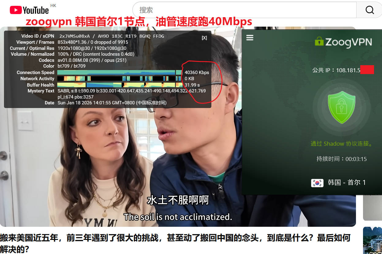 11月16日上午,电信WiFi下,先后测试了韩国首尔1、美国达拉斯两个节点,连接协议都是默认的opnevpn udp协议,使用speedtest测试速度分别为:33Mbps、74Mbps ;测试youtube油管速度韩国首尔1节点为 31Mbps,表现相当优秀!然后再次连接韩国首尔节点,默认连接成功协议为wireguard协议,油管速度跑40Mbps。同一时间,安卓手机端也进行了测试,见后面手机端测试,如下图所示