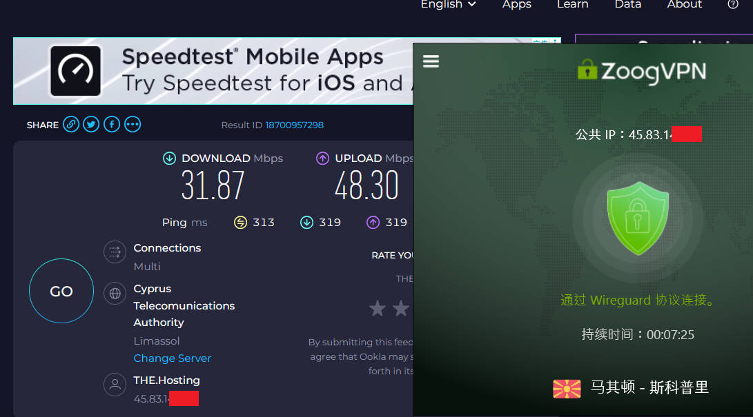 1月11日上午,电信WiFi下,今日特意选择了国内封杀最严重的Wireguard协议(wireguard 协议连接速度最快,但几乎全网梯都会连接困难),测试了对国内距离较近的香港、日本和韩国节点,成功了香港2、日本2节点,但是速度很拉胯,在5Mbps。于是测试了冷门的美洲或非洲节点,先后测试了马其顿、格鲁吉亚、阿联酋节点,测试youtube油管速度分别为37Mbps、20Mbps、21Mbps、 ,使用speedtest测试速度分别为:32Mbps、23Mbps、25Mbps,表现非常优秀!如下图所示