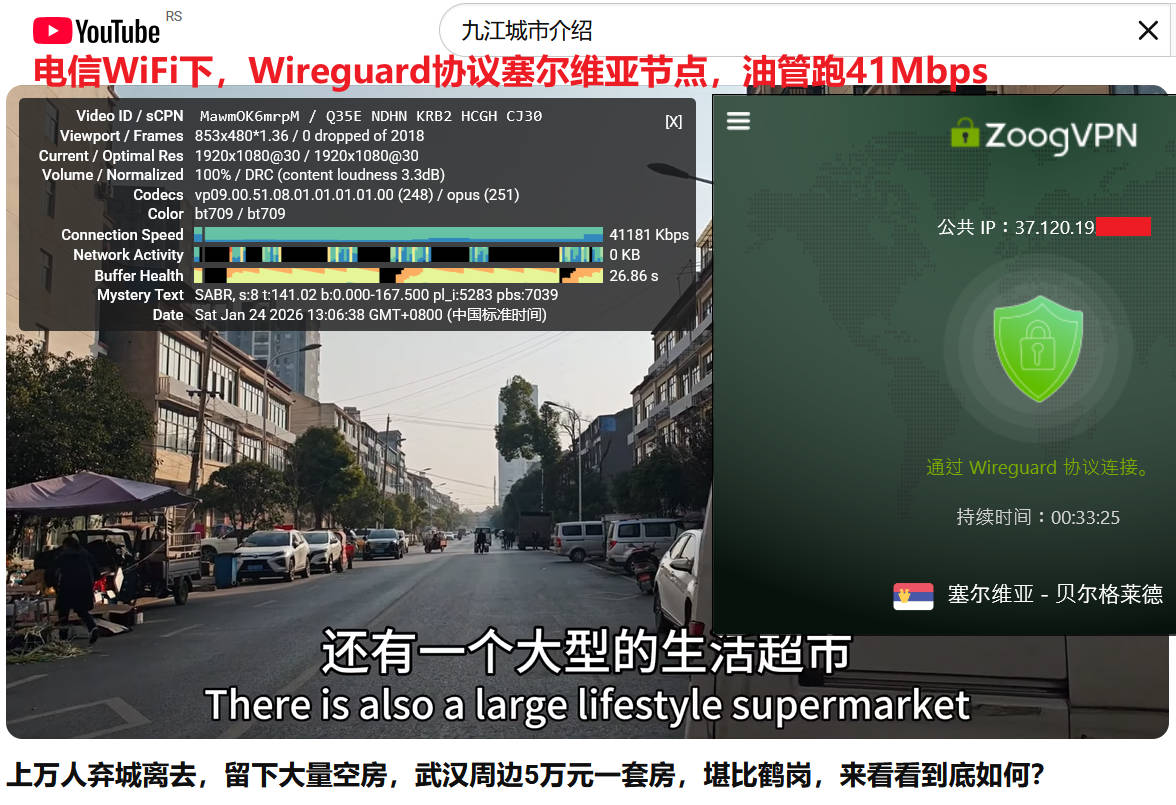 1月24日中午,电信宽带WiFi,zoogvpn上随机使用自动模式连接测试了塞尔维亚、日本东京2、美国硅谷三个节点,其中塞尔维亚、日本东京2连接协议是Wireguard,美国硅谷是openvpn udp协议,使用speedtest测试速度分别为:100Mbps、168Mbps、67Mbps ;测试youtube油管速度分别为41Mbps、52Mbps、44Mbps,三个节点表现非常优秀,如下图所示