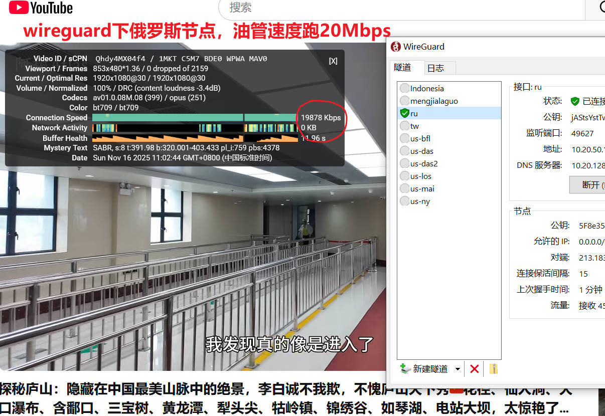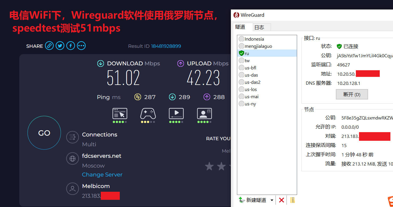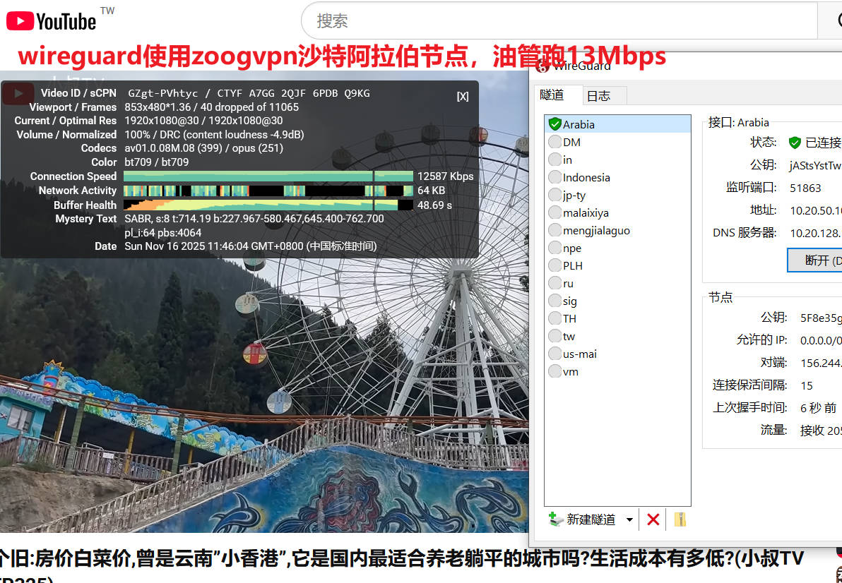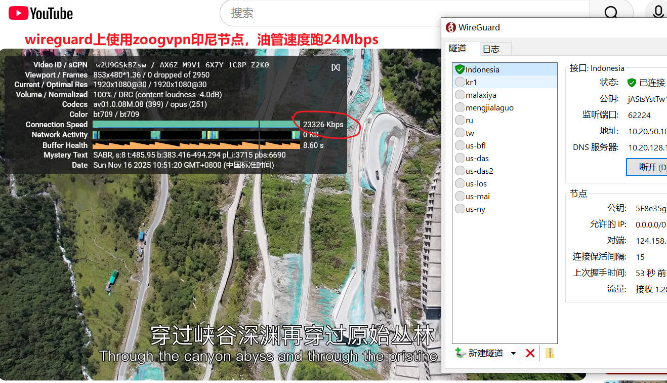 随机下载并在Wireguard中导入了Zoogvpn 沙特阿拉伯、印度尼西亚、俄罗斯、美国迈阿密节点,都能在3秒内成功连接上,并且油管和speed 速度都不错,具体的看图吧。