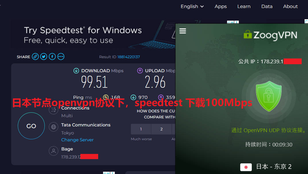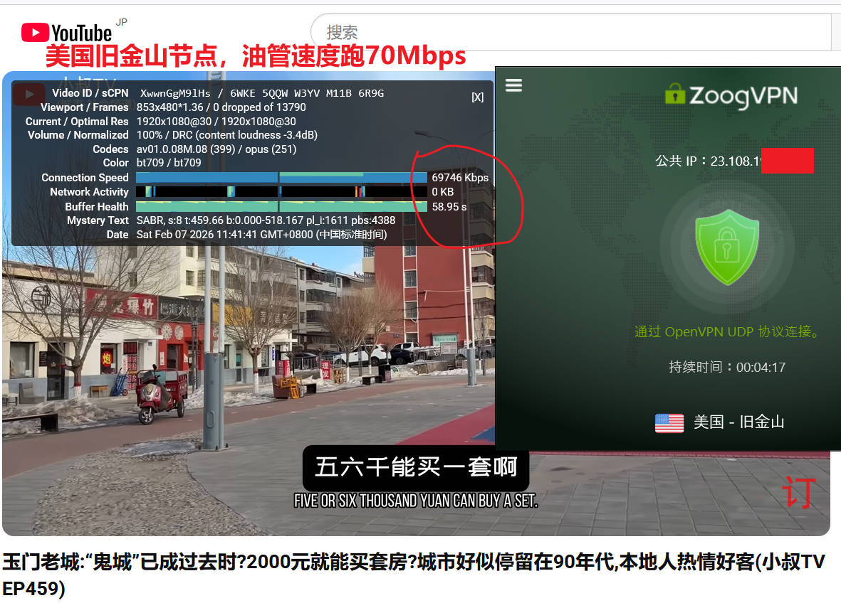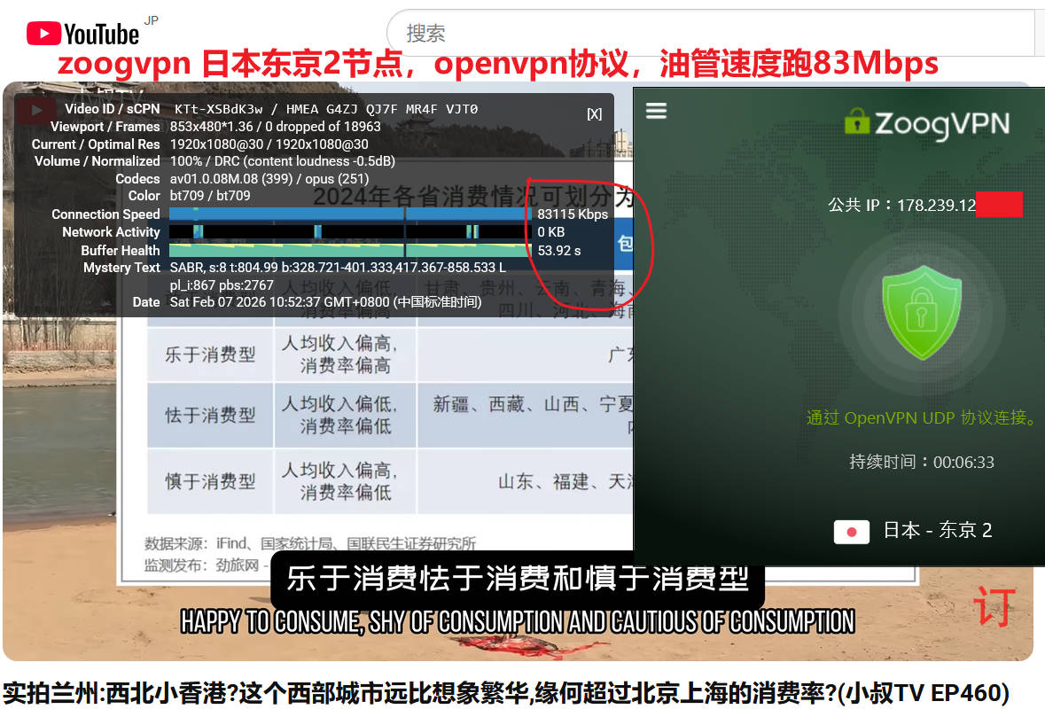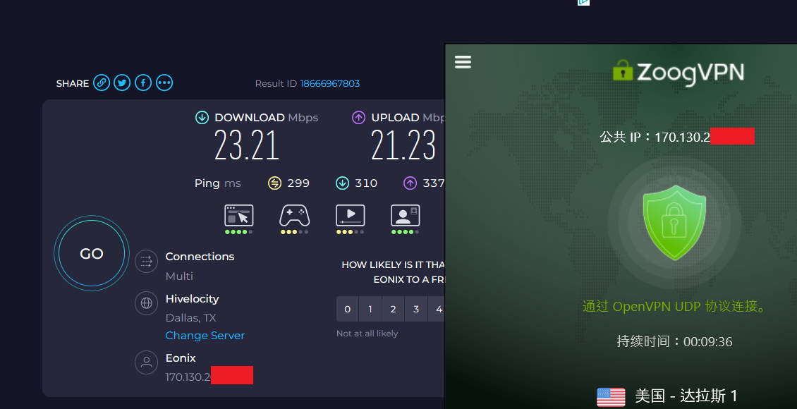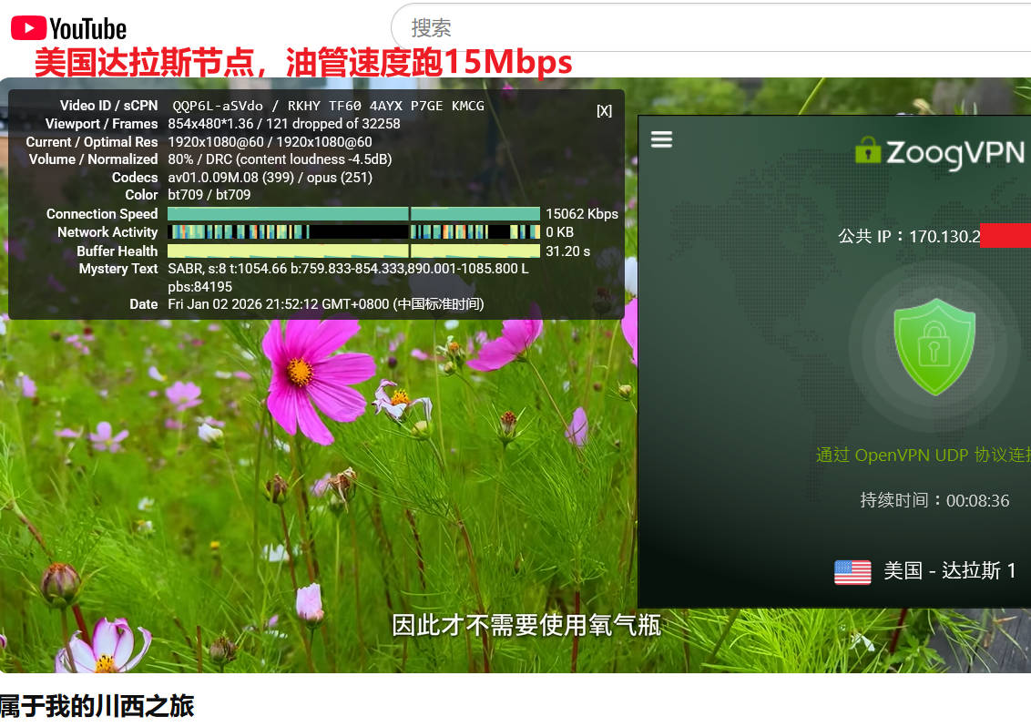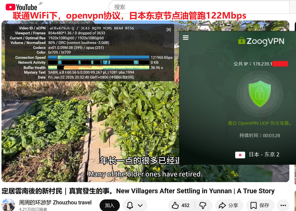 2026年zoogvpn 实测来袭,1月2日晚高峰期,联通宽带WiFi(联通无线路由器隔一个房间,笔记本连接wifi下实测带宽就跑120Mbps ),分别测试了日本东京2、美国达拉斯1两个节点,默认连接协议都是openvpn协议,测试youtube油管速度分别为122Mbps、15Mbps ,使用speedtest测试速度分别为:55Mbps、23Mbps,表现非常优秀!如下图所示