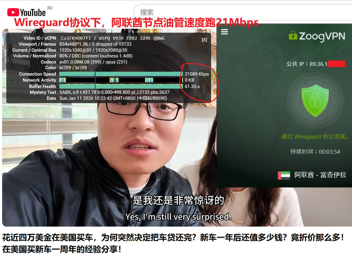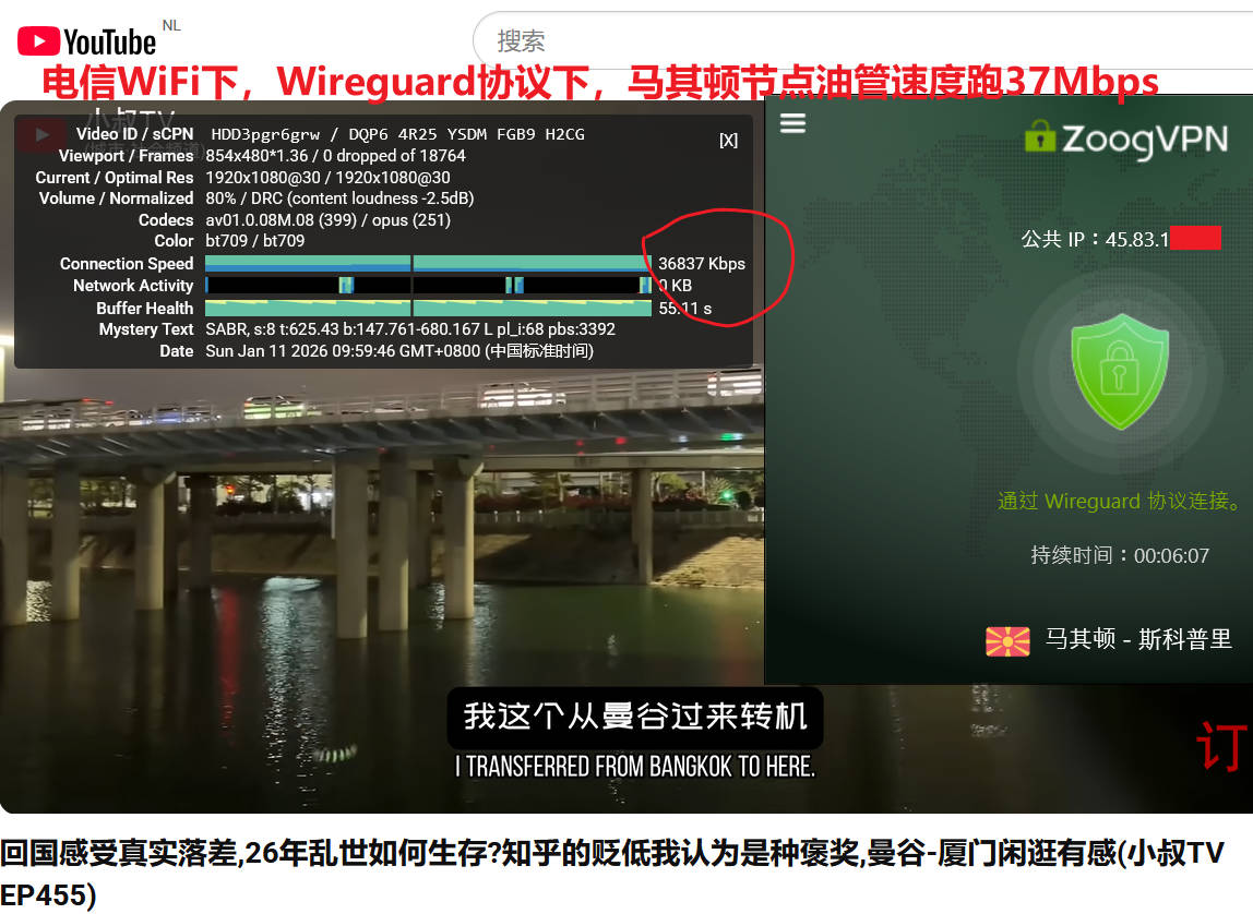 1月11日上午,电信WiFi下,今日特意选择了国内封杀最严重的Wireguard协议(wireguard 协议连接速度最快,但几乎全网梯都会连接困难),测试了对国内距离较近的香港、日本和韩国节点,成功了香港2、日本2节点,但是速度很拉胯,在5Mbps。于是测试了冷门的美洲或非洲节点,先后测试了马其顿、格鲁吉亚、阿联酋节点,测试youtube油管速度分别为37Mbps、20Mbps、21Mbps、 ,使用speedtest测试速度分别为:32Mbps、23Mbps、25Mbps,表现非常优秀!如下图所示
