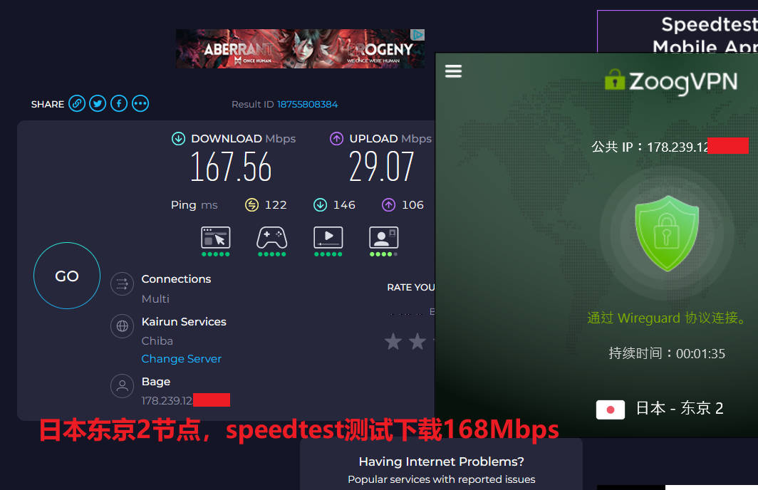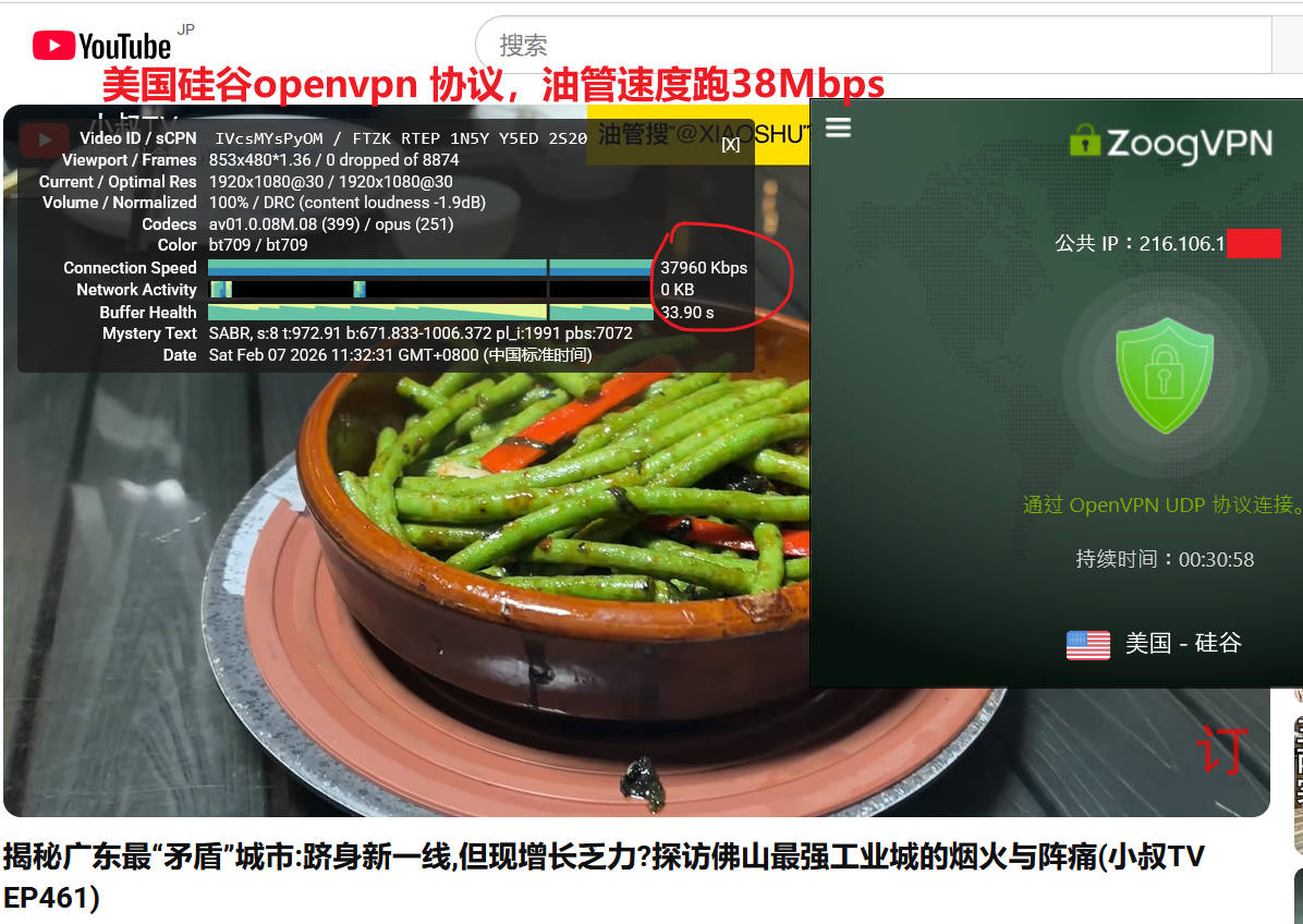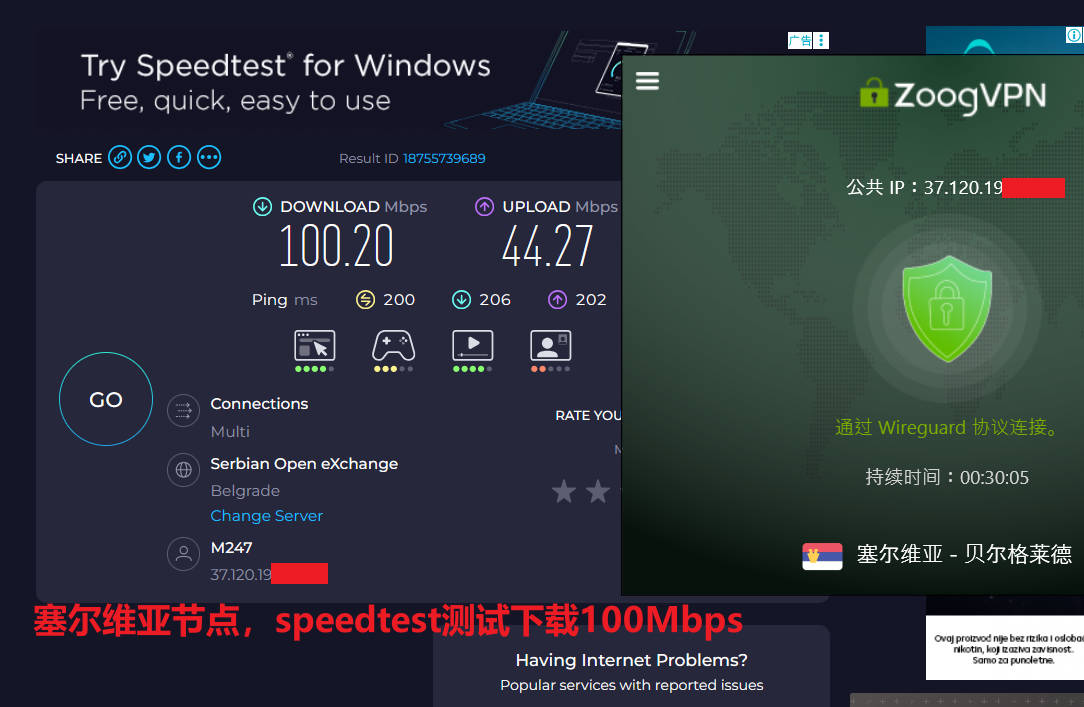 1月24日中午,电信宽带WiFi,zoogvpn上随机使用自动模式连接测试了塞尔维亚、日本东京2、美国硅谷三个节点,其中塞尔维亚、日本东京2连接协议是Wireguard,美国硅谷是openvpn udp协议,使用speedtest测试速度分别为:100Mbps、168Mbps、67Mbps ;测试youtube油管速度分别为41Mbps、52Mbps、44Mbps,三个节点表现非常优秀,如下图所示