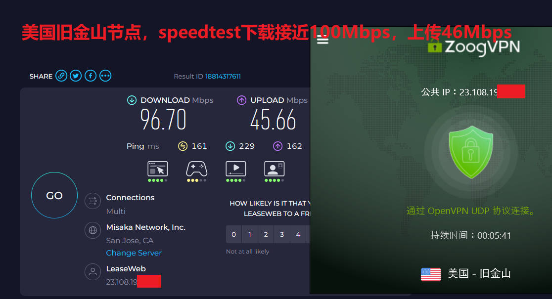 2月7日上午,电信宽带WiFi,zoogvpn上随机使用自动模式连接测试了日本东京2、美国硅谷、美国旧金山三个节点,默认都是openvpn udp协议,使用speedtest测试速度分别为:100Mbps、61Mbps、97Mbps ;测试youtube油管速度分别为83Mbps、61Mbps、70Mbps,三个节点表现非常优秀,尤其是美国旧金山节点,上传速度居然达到了惊人的46Mbps,站长已经列入收藏。如下图所示